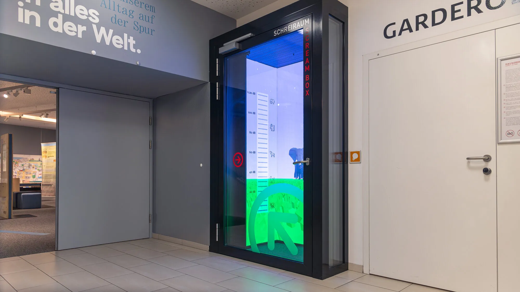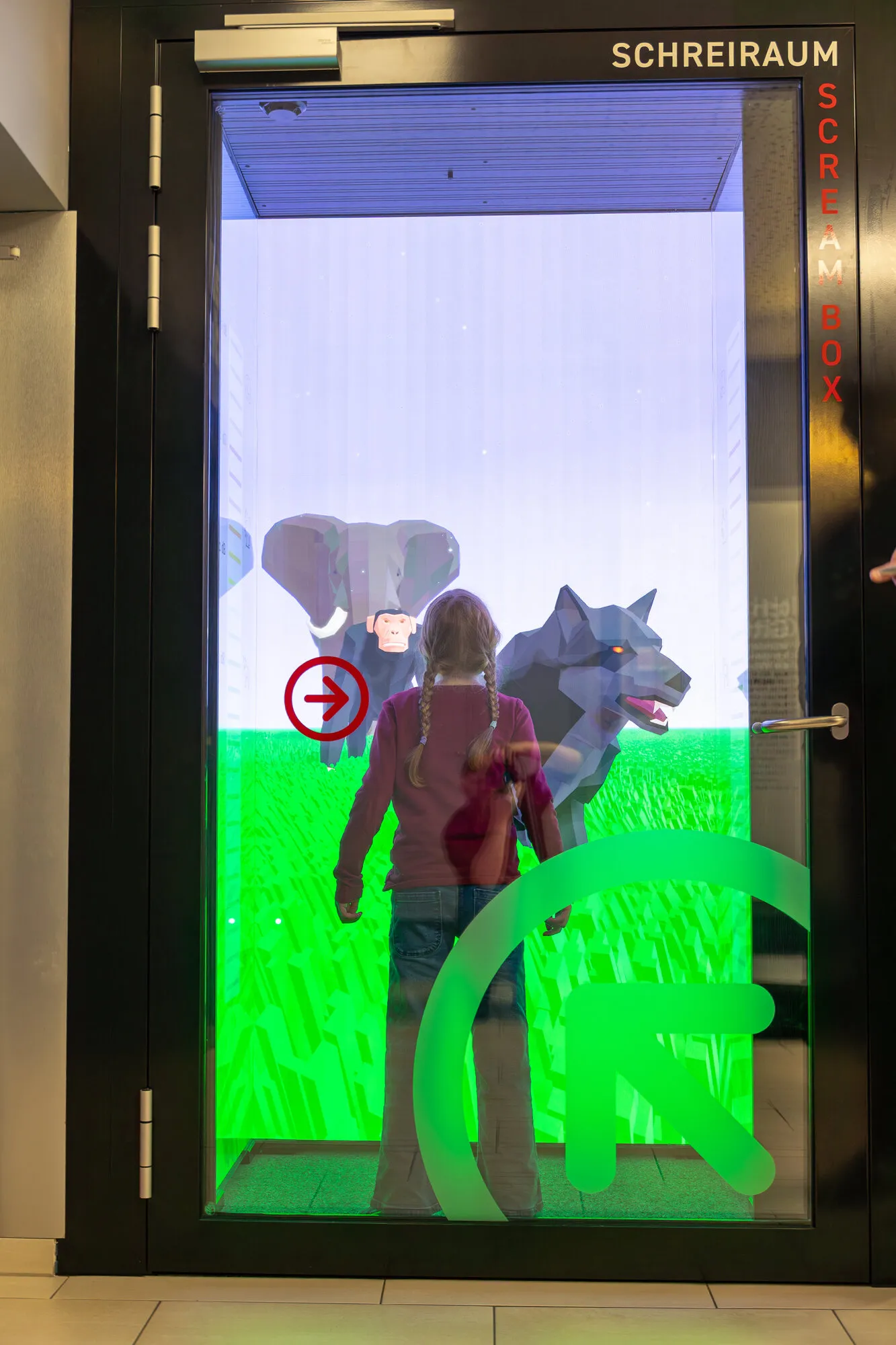 Schreiraum is an interactive sound installation at AUDIOVERSUM where visitors experience the loudness of their voices as evolving animated animal forms on an immersive LED screen. The installation makes volume levels intuitively understandle and clearly communicates the decibel scale to younger audiences.